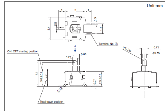 3.4x3x2.3mm 小型单向动作型 3.4×3.0mm,业界最小级别,可以对应小型数字设备。